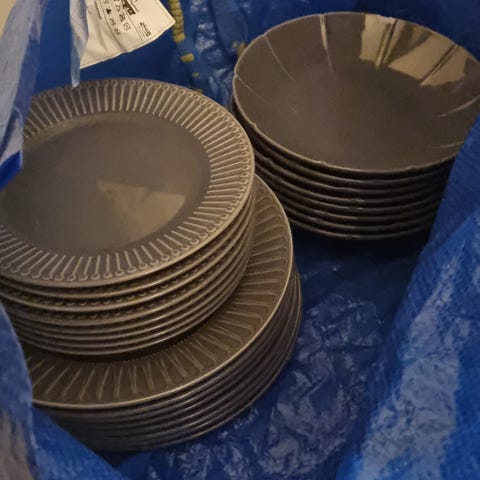 IKEA sort stel bestående af 15 spise-, 13 dybe- og 12 frokost/desserttallerkener samt 11 krus. Velegnet til daglig brug i køkkenet.