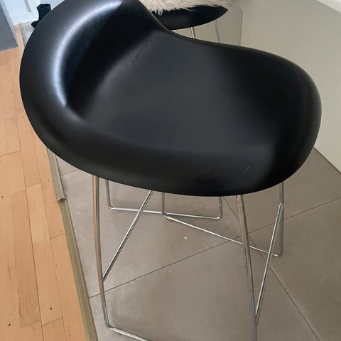 Stel af bøg eller eg, er ikke sikker, sort plast skal med polstret sæde i sort hvidt mønster. Har været brugt som kontorstol, men der har nærmest aldrig siddet nogen i den.