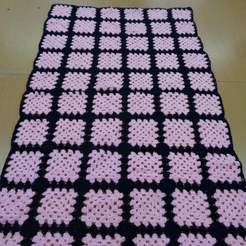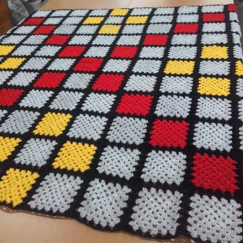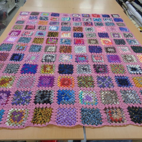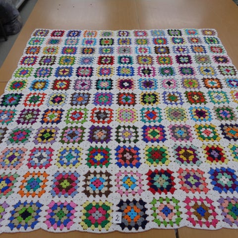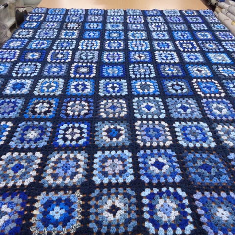 En lækker lun sag i form af et bedstemortæppe (oldemortæppe) hæklet i strømpegarn indeholdende bla. uld, med blå acryl kanter, af min mor, i røgfrit hjem.