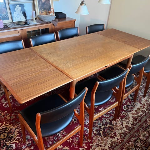 Erik Buch spisebord i teak med med tillægsplader og otte spisestuestole