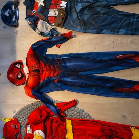 Spiderman børnekostume i blå og rød med netdetaljer og tutu nederdel. Kostumet er designet til børn og har karakteristiske Spiderman-mønstre.