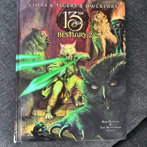 13th Age Bestiary bog med illustrationer og beskrivelser af fjender og monstre til rollespil. Indeholder detaljer om forskellige væsner og deres egenskaber.