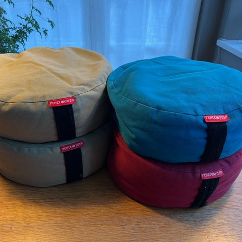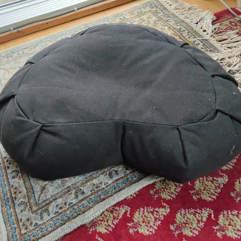 Halvmåneformet meditationspude i bordeaux farve lavet af bomuld. Puden har en lynlås, der gør det muligt at fjerne betrækket til vask eller udskiftning. Velegnet til meditation og afslapning.