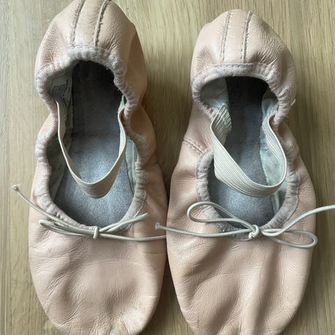 Balletskoene er lavet af lysbrunt læder og har en elastisk åbning for bedre pasform. Skoene har en fuld sål med let slid på den nederste del. De måler 18 cm i længden, hvilket typisk passer til yngre børn. Skoene er designet til at være komfortable og give støtte under dans. Tags: dans, ballet, børnesko