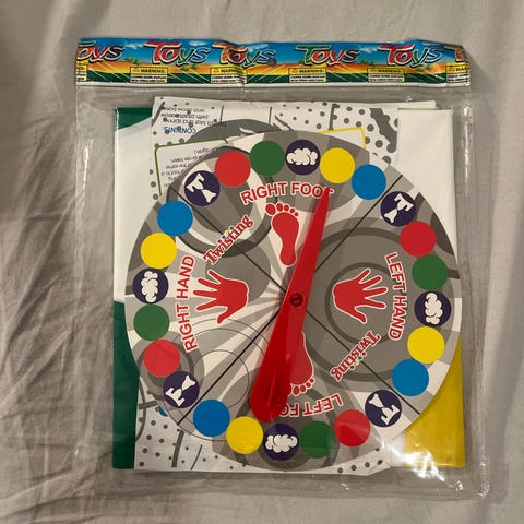 Kassen indeholder Twister spillet, der består af en stor plastikmåtte med farvede cirkler og en spinner med instruktioner. Spillet bringer folk sammen ved at udfordre deres balance og fleksibilitet ved at placere deres hænder og fødder på bestemte farvede cirkler i henhold til spinnerens angivelser. Velegnet til spillere over 6 år.