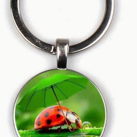 En hæklet nøglering formet som en solskinsblomst. Den har gule kronblade, en brun midte, og grønne detaljer. Den er designet med et rundt metalnøglehul, som gør det nemt at fastgøre til en taske eller nøgler. Størrelsen er 13 cm.