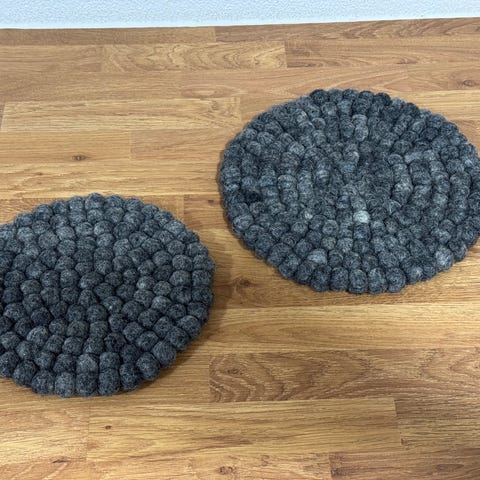 Et par filt bordskånere i rund form med en diameter på 20 cm. De er sammensat af små uldkugler i forskellige nuancer af blå, grå og beige, hvilket giver dem et unikt og dekorativt udseende. Bordskånerne er velegnede til at beskytte overflader mod varme og er en stilfuld tilføjelse til borddækning.