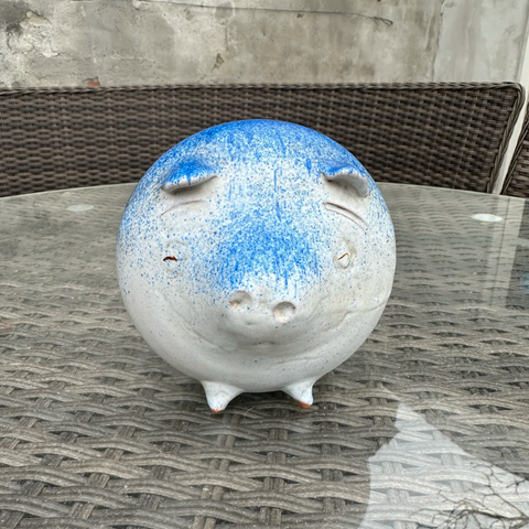 Dette er en keramisk sparegris med en længde på 16 cm. Den er hvid med blå blomsterlignende motiver på kroppen. Der er en åbning på toppen til indkast af mønter, og en åbning i bunden til at tage dem ud. Designet er enkelt og sødt, hvilket gør den til en dekorativ genstand i hjemmet. Tags: sparebøsse, gris, hvid, blå, keramisk.u