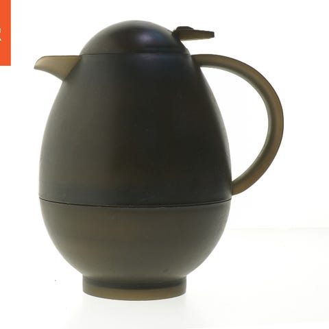 Termokande med blomsterdesign. Kanden har et låg med en rød prik og ergonomisk hank. Den er lavet i plast med blå og beige farver med et dekorativt blomstertryk. Bunden af kanden viser serienummer og produktionsdetaljer.
