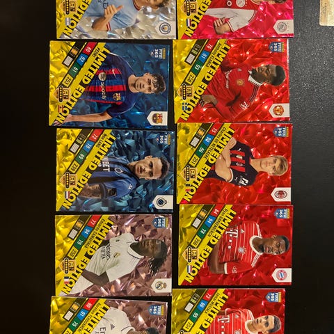 Panini FIFA 365 Limited Edition fodboldkort med billeder af forskellige fodboldspillere. Kortene er samleobjekter og kan bruges til samling og udveksling blandt fodboldfans.