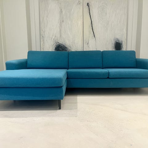 Smukkeste støvet blå chaiselong sofa fra Bolia i slidstærkt, blødt og rengøringsvenligt kvalitetsstof. Sofaen fremstår helt uden pletter eller anden synlig slidtage.