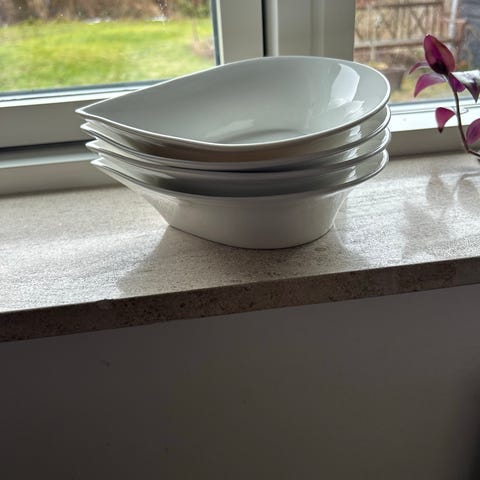 Mette Blomsterberg skåle i hvid porcelæn med en længde på 20 cm og brede på 15,5 cm. Skålene er dråbeformede og kan bruges til servering af dessert, snacks eller andet.
