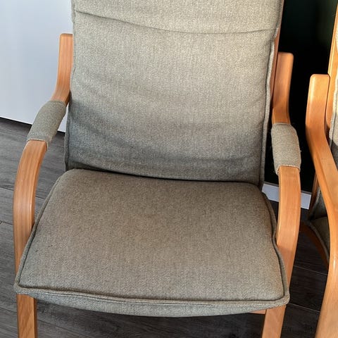 Hej sægler disse 2 fede lænestole med skammel med sort flet. De ligner albert stole men der er ikke noget mærke på dem. Så jeg sælger dem som ukendt mærke. De er I super kvalitet og god stand. De har lidt patina på armlænet.
