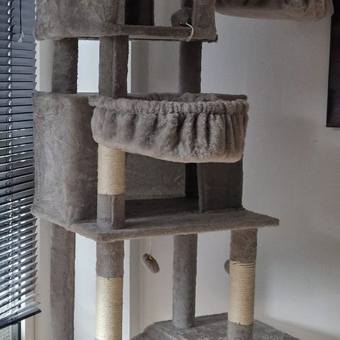Meget lidt brugt kattetræ med kattehule og en lille fastgjort legemus i beige sælges.