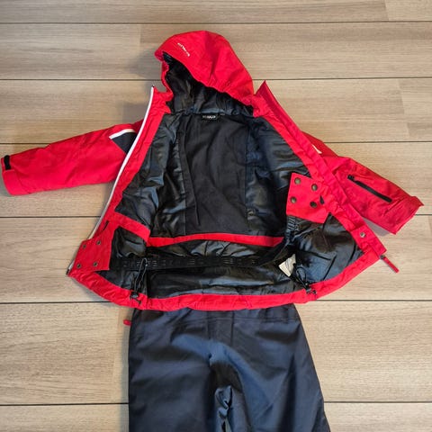 Atomic Redster Pro skisæt inklusive ski, støvler og stave. Skiene er røde med bindingssystem, støvlerne er grå med justerbare spænder, og skistavene er sorte med håndtag. Sættet er egnet til alpinski.