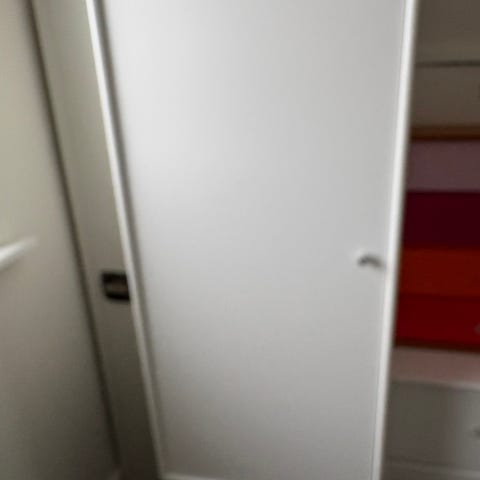 Skab 2 er indrettet med en lille låge, en mellem låge samt to skuffer. Bag mellem lågen i skab 2 er der to hylder. Der er bøjlestang i begge skabe.