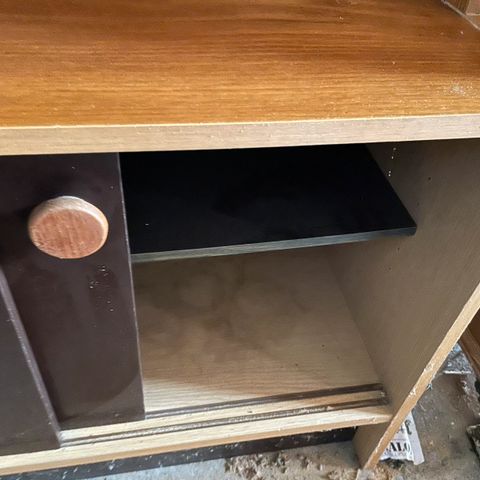 Retro reol med skuffer og mørkegrøn bagbeklædning.
