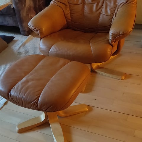 Lænestol med fodskammel. Modellen hedder Tango. Specifikationer kan ses her: https://www.bo-bedre.com/tango-laenestol-og-fodskammel