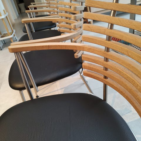6 stk. meget velholdte Tiger spisebords stole med armlæn. Designet og signeret af Henrik Lehm med sæde polstret i sort Naver Select læder, ryg i sortbejdset ask og stel i sort stål.