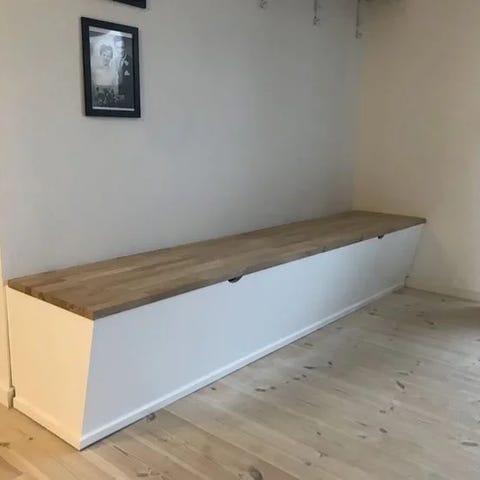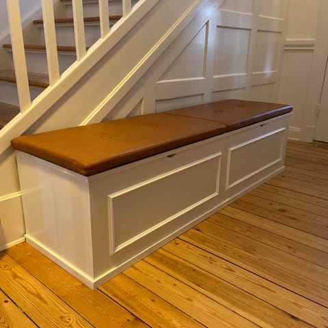 Fodlisten bliver bygget ind i bænken så den går helt ind til væggen. Bænken er med vippelåg og med valgfri ruminddeling.