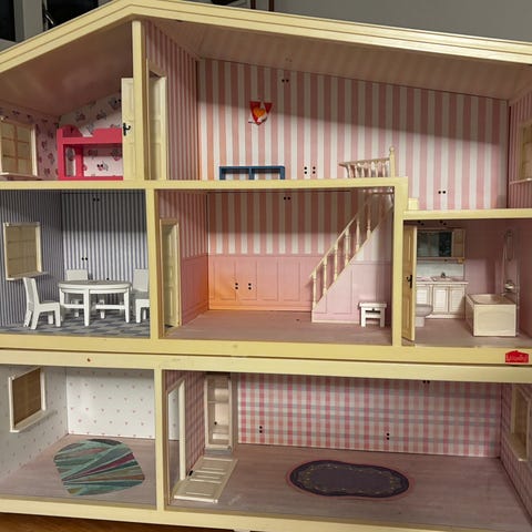 Lundby dukkehus med flere rum fordelt på to etager. Dukkehuset har indvendig tapet i forskellige farver og mønstre, herunder gulstribet, lyserødt og blåt flisegulv. Huset er åbent på forsiden for nem adgang og leg. Møbler medfølger
