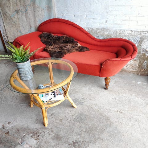 Antik chaiselong med mønstret stofbetræk. Møblet har en klassisk form med høj ryg og udformede armlæn. Egnet til afslapning og som dekorativt element i stuen eller soveværelset.