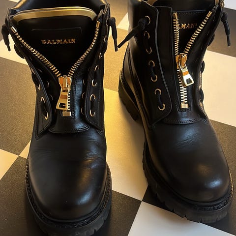 Støvler, str. 39, Balmain, Sort, Næsten som ny, Flotte sorte suede Biker-snørestøvler fra Balmain med messing nitter i str 39. Skaftet måler 29 cm. De er brugt 3 gange. Sælges for 1000 kr plus evt porto. Se også mine andre annoncer!!!