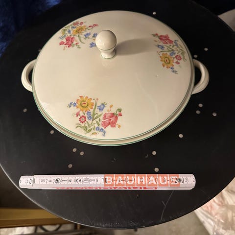 Elegant terrin fra det ikoniske Raili-stel af Arabia, designet af Svea Granlund i 1950’erne. Denne terrin har en diameter på 18 cm og fremstår i god stand uden skår eller revner. Det fine blomster- og guldkantede mønster giver et tidløst og stilfuldt udtryk – perfekt til både hverdag og fest.