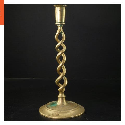 Denne antikke lysestage er fremstillet af messing og har en kompleks og detaljeret udformning med en kobling af blomstrede mønstre og en central ansigtsfigur. Stagen er 12 cm i højden og giver mulighed for at placere et enkelt stearinlys. Designet har en klassisk æstetik, der kan tilføje en vintage touch til indretningen i et rum. Tags: antik, messing, lysestage, dekoration.