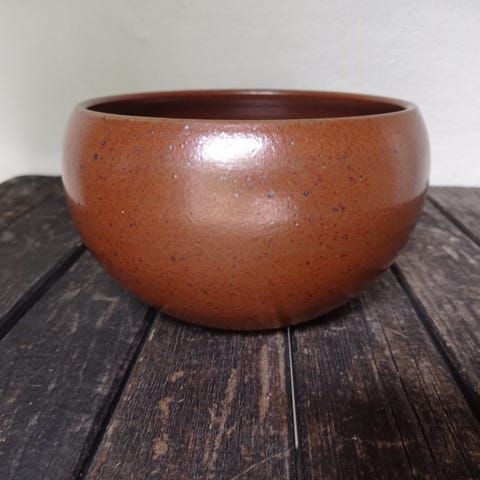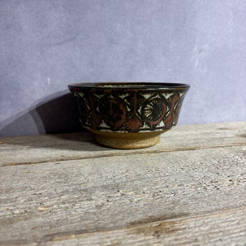 Keramisk skål med en diameter på 14 cm. Skålen er et typisk Michael Andersen-produkt. Den har et dekorativt mønster med brune og blå nuancer. På undersiden findes markeringen 'Bornholm', som indikerer oprindelse. Skålen har bløde filt pads på bunden for at forhindre skader på underlaget. Den kan bruges som dekorativ genstand eller til opbevaring af mindre genstande.