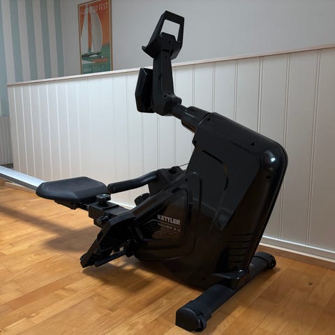 Kettler Coach E romaskine med digitalt display til måling af tid, distance og kalorier. Romaskinen har justerbar modstand og ergonomisk sæde, designet til hjemmebrug.