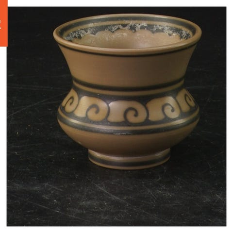 Keramikvasen er håndmalet og har et blomsterdesign med røde blomster og grønne blade. Den har en rund form og en bred åbning øverst, hvilket gør den velegnet til blomsterarrangementer. Bunden af vasen viser tydelige tegn på brug. Størrelsen er Ø 10x19 cm. Tags: keramik, blomstret, håndmalet.