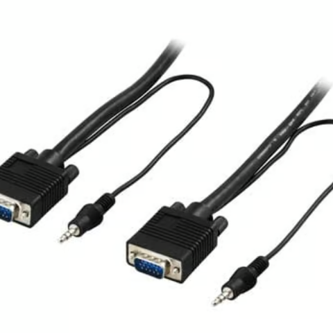 Det er et 154 cm langt videokabel med VGA-stik i hver ende. Kabelen er beskyttet med et ydre lag af sort plastik, og der er tape omkring stikene. Et VGA-stik bruges typisk til computer- og skærmforbindelser.