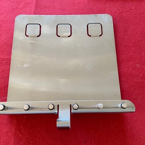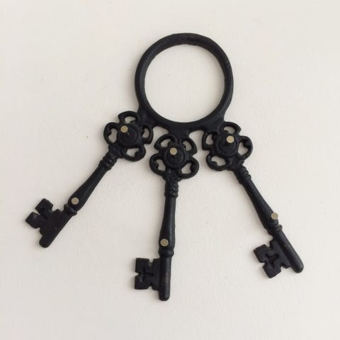 Nøgleholder lavet af træ, designet i form af en halvmåne med tre hestehoveder som kroge. Hestehovederne er i metal og hver fungerer som en individuel krog til ophængning af nøgler eller mindre genstande. En metalbøjle fungerer som ophængningsmekanisme.