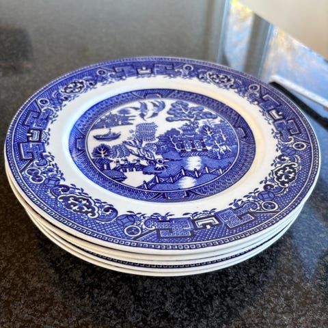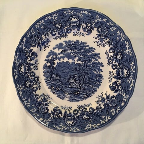 Et par dekorative porcelænstallerkener fra Alfred Meakin med motiv af 'Famous Cottages'. Tallerkenerne har et detaljeret design med landskabsmotiver, herunder et idyllisk hus. De er lavet af porcelæn med en diameter på 18 cm. Bagsiden af tallerkenerne er markeret med producentens navn og designets titel.