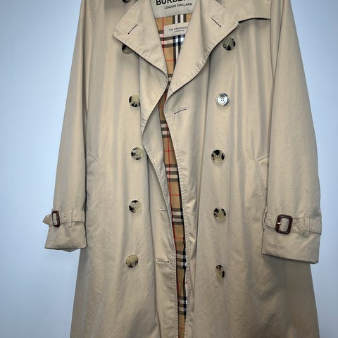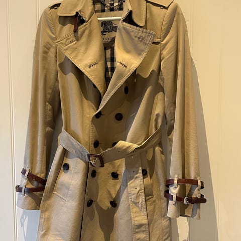 Burberry frakke i størrelse 40 til kvinder. Frakken er grå og lavet af uldmateriale. Designet inkluderer dobbeltradede knapper og bælte ved taljen. Indvendigt foret med Burberrys karakteristiske ternede mønster. Er brugt, men fejler absolut ingenting og er stadig i rigtig pæn stand.