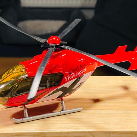 Denne legetøjshelikopter er designet med øje for detaljer og indeholder en figur indeni. Helikopteren er primært rød og har en roterende propel på toppen såvel som hjul under til 'landingsstel'. På siden af helikopteren står der 'PAT 3'. Størrelsen på dette legetøj er 26,5 cm i længden. Det er ideelt til børneleg og samling af transport legetøj.
