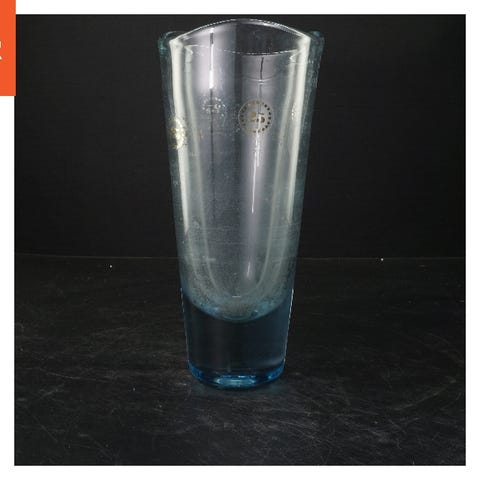 Denne vase har en unik og elegant form, lavet af blå glas, med små bobler spredt over hele overfladen. Den måler 29 cm i højden og har en bred bund, som smalner opad i en dobbeltrørform. Vasen er ideel som dekoration i ethvert hjem og kan bruges til blomsterarrangementer eller som et stilfuldt statement piece.