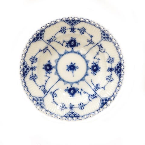 Dette er et sæt med seks porcelænstallerkener med en diameter på 14 cm. Tallerkenerne er hvide med et blåt blomster- og strejmønster. De er fra Royal Copenhagen, hvilket kan ses på bagsiden af tallerkenerne.