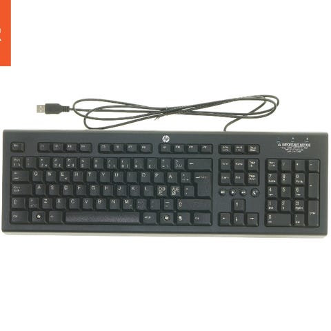 Dette er et USB tastatur med en standard layout, der inkluderer funktionstaster, navigationsknapper og et numerisk tastatur. Tastaturet er designet til at forbindes med computere via en USB-port og er lavet af sort plast. Det måler 44,5x17,5 cm, hvilket gør det til et standard størrelse tastatur egnet til skrivebordsbrug.