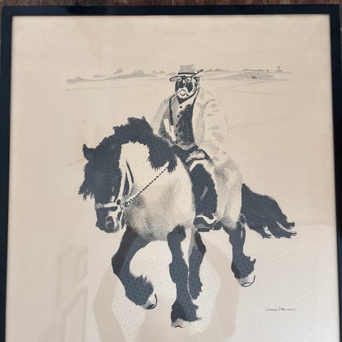 Signeret print/tryk, ganske stort, forestiller en mandlig rytter med pibe på en kraftigt bygget hest.