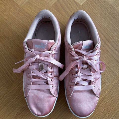 Disse sko er et par Puma sneakers, designet til komfort og stil. De har en overdel i blå ruskind med røde læderdetaljer og mesh-stof ved anklen for ekstra ventilation. Puma-logoet ses tydeligt både på siden og bagsiden af skoene. Indersiden er polstret med skum for ekstra komfort, og sålen er lavet af hvid gummi med markant mønster for forbedret greb. Skoene er i størrelse 38 og har snørebånd til lukning. Tags: sneakers, Puma, sport, mode.