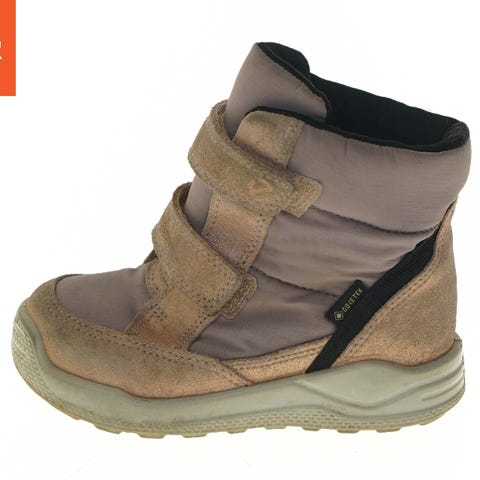 Disse børnestøvler er lavet af brunt læder og har snørebånd foran. De har også en lynlås på siden for nem ere på -og aftagning . Indeni er støvlerne foret for ekstra varme. Sålen er lavet af gummi med et grid-mønster for bedre greb.