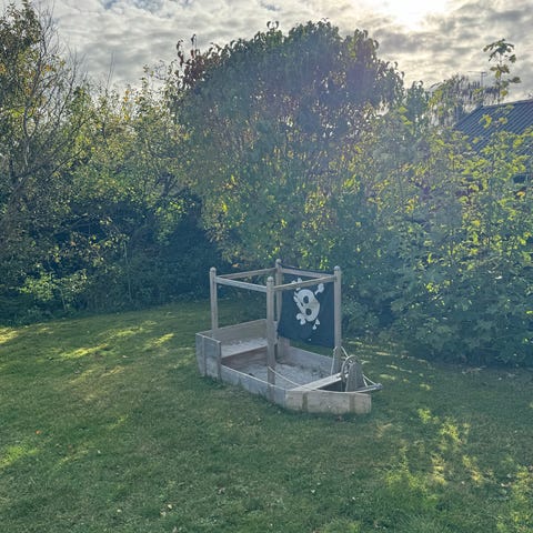 Kinetic Sand piratskattekiste. Den er købt i sin tid hos BR til 219.95 kr og virker som om den er lidt sværere at anskaffe i dag.