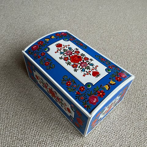 Æsken er fremstillet af plastik og har en brun og gylden farve, med dekorative detaljer som en kisteform og en lås på fronten. Kisten har en indvendig plads til opbevaring af små legetøjsgenstande, og den kan åbnes fra toppen.