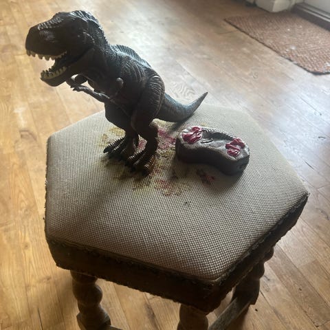 Dette er et fjernstyret dinosaurlegetøj, formet som en Tyrannosaurus Rex. Dinosauren er 46 cm lang og er hovedsageligt udført i mørkegrøn plast med lysebrun underside og detaljer. Den har et realistisk design med skarpe tænder, kløer og rygfinne. Legetøjet kommer med en matchende controller, som gør det muligt at styre dinosaurens bevægelser.