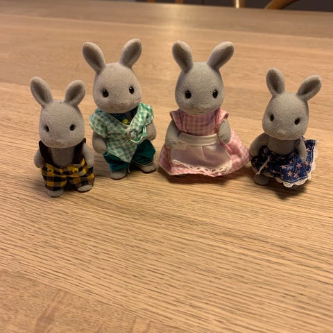 Sylvanian Families kaninfigurer sæt bestående af fire kaninfigurer i forskellige tøj.