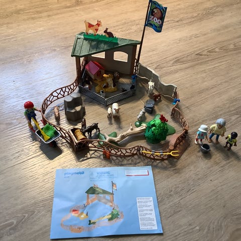 Dette er et Playmobil-sæt med et zoologisk tema, kaldet 'Super Set'. Sættet inkluderer dyrefigurer som pandabjørne, zebraer og giraffer, samt to menneskefigurer - en dyrepasser og en dyrelæge. Sættet indeholder også forskellige tilbehør såsom en trillebør, høtyv og dyrefoder. Dette legetøj er beregnet til børn i alderen 4-10 år. Billedet viser også et klinikområde for dyrene. Leveres i original emballage.