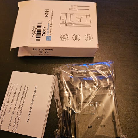 JVC oplader og 2 stk batterier, der lyses som om batterier kan oplades. Har ikke mulighed for at teste da mit kamera gik i stykker.