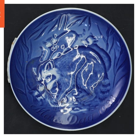 Tallerken fra Bing & Grøndahl med motiv af en ko og kalv. Den er fra 'Mother's Day' kollektionen fra 1987. Diameteren på tallerkenen er 15 cm. Bagsiden viser Bing & Grøndahls logo og modelnummer 9387.